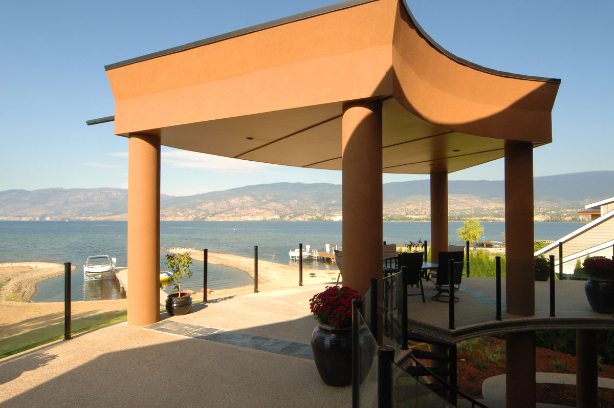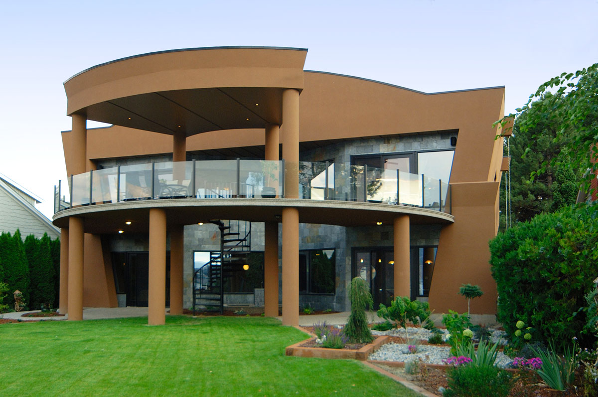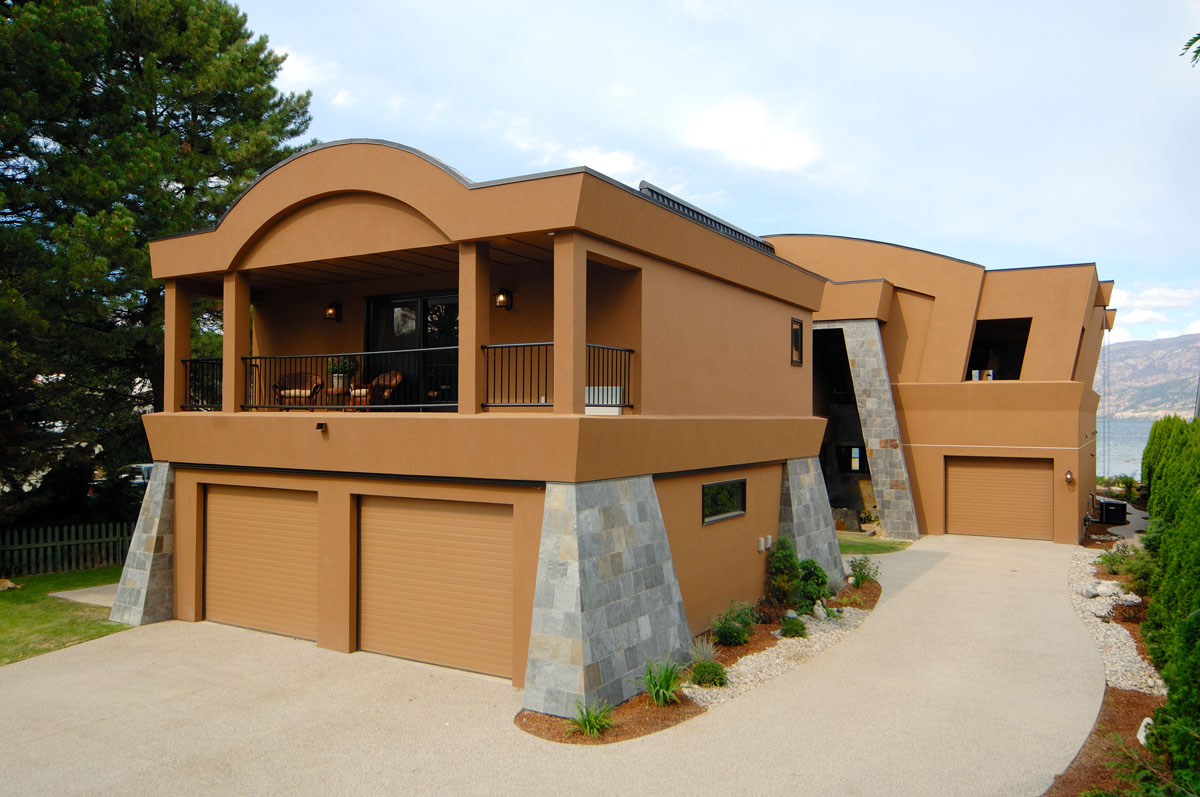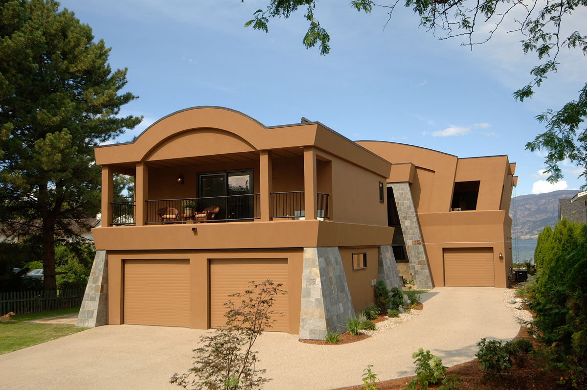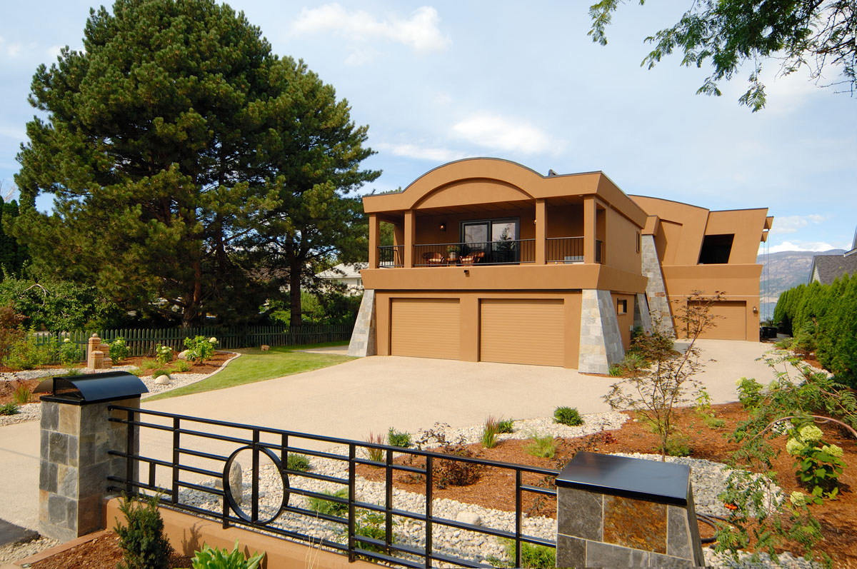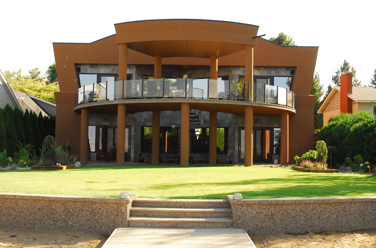 Kelowna Lakefront Properties - Gerrits Lakeshore Residence Their next lakefront lot was sited in between two existing homes with high property line hedges. With our history of doing custom homes on a team approach, it made for the next, "out of the box" experience. This symmetrically balanced concept was conceived by us and detailed by the Gerrits. (Homescape Building & Design Inc.) I felt that there was an opportunity to create privacy and a panoramic view by moving the living level up to the second floor. We simply added an elevator into the design to bring the groceries up to the kitchen level. Once up at that level a completely different view presented itself. The half round deck concept allowed for a 180 degree view. We designed the garage with a separate guest suite above it, connected by an enclosed bridge.