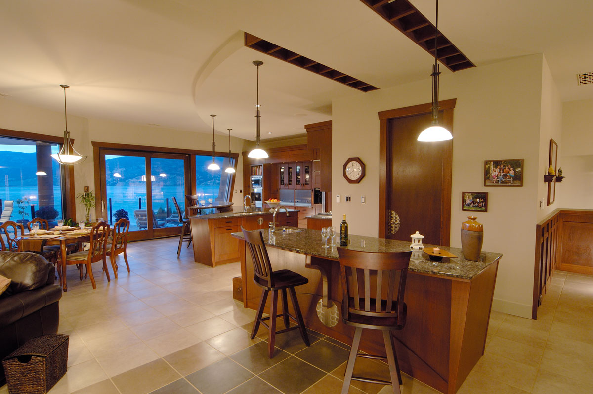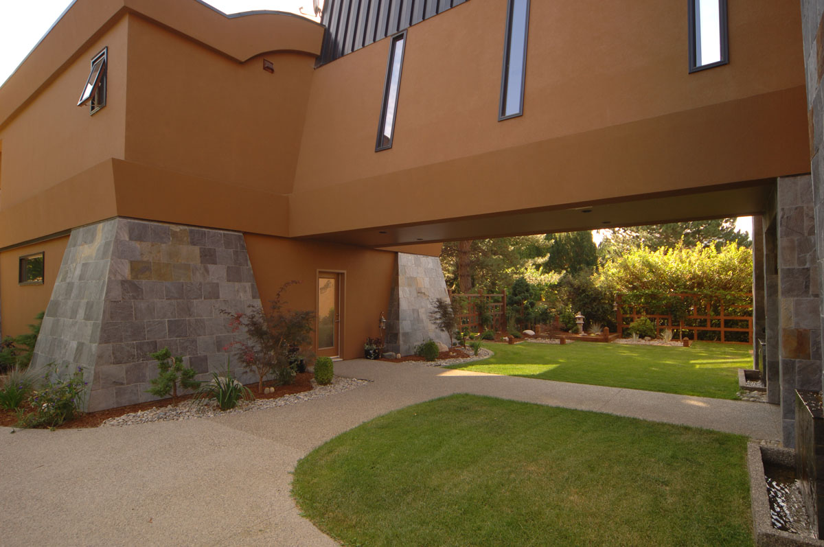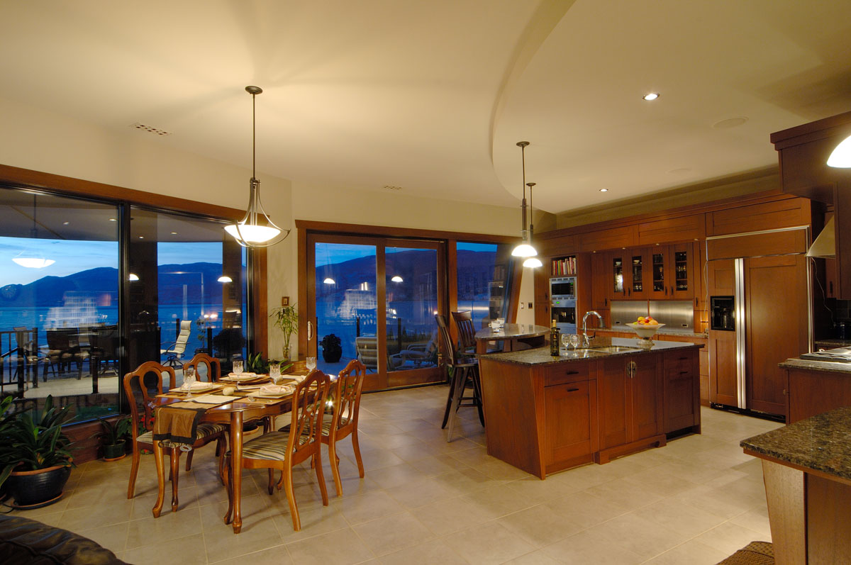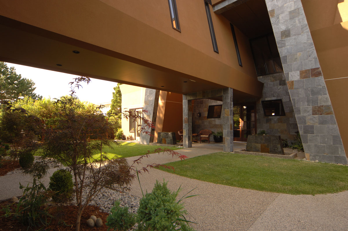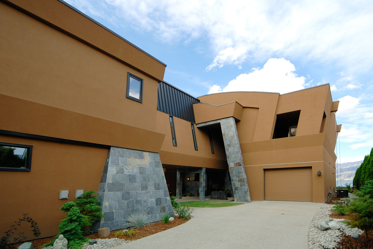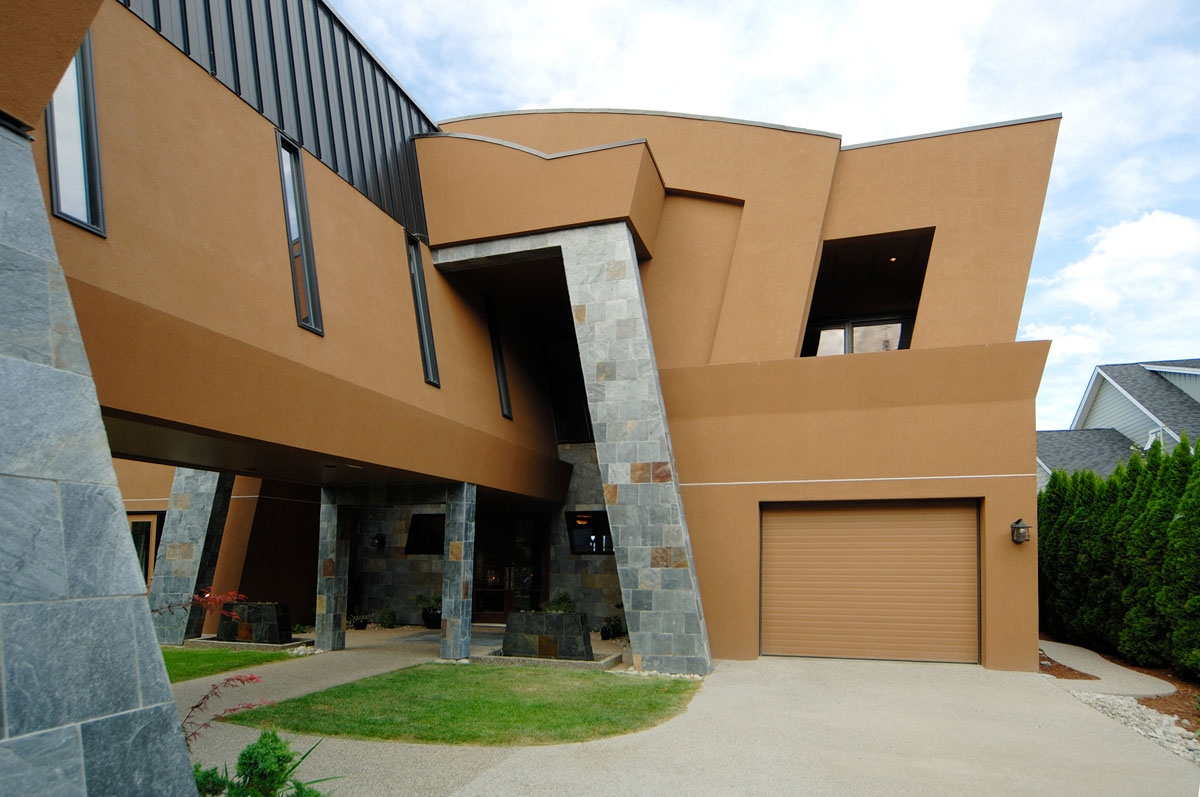 Kelowna Lakefront Properties - Gerrits Lakeshore Residence Their next lakefront lot was sited in between two existing homes with high property line hedges. With our history of doing custom homes on a team approach, it made for the next, "out of the box" experience. This symmetrically balanced concept was conceived by us and detailed by the Gerrits. (Homescape Building & Design Inc.) I felt that there was an opportunity to create privacy and a panoramic view by moving the living level up to the second floor. We simply added an elevator into the design to bring the groceries up to the kitchen level. Once up at that level a completely different view presented itself. The half round deck concept allowed for a 180 degree view. We designed the garage with a separate guest suite above it, connected by an enclosed bridge.