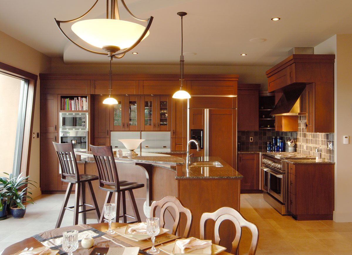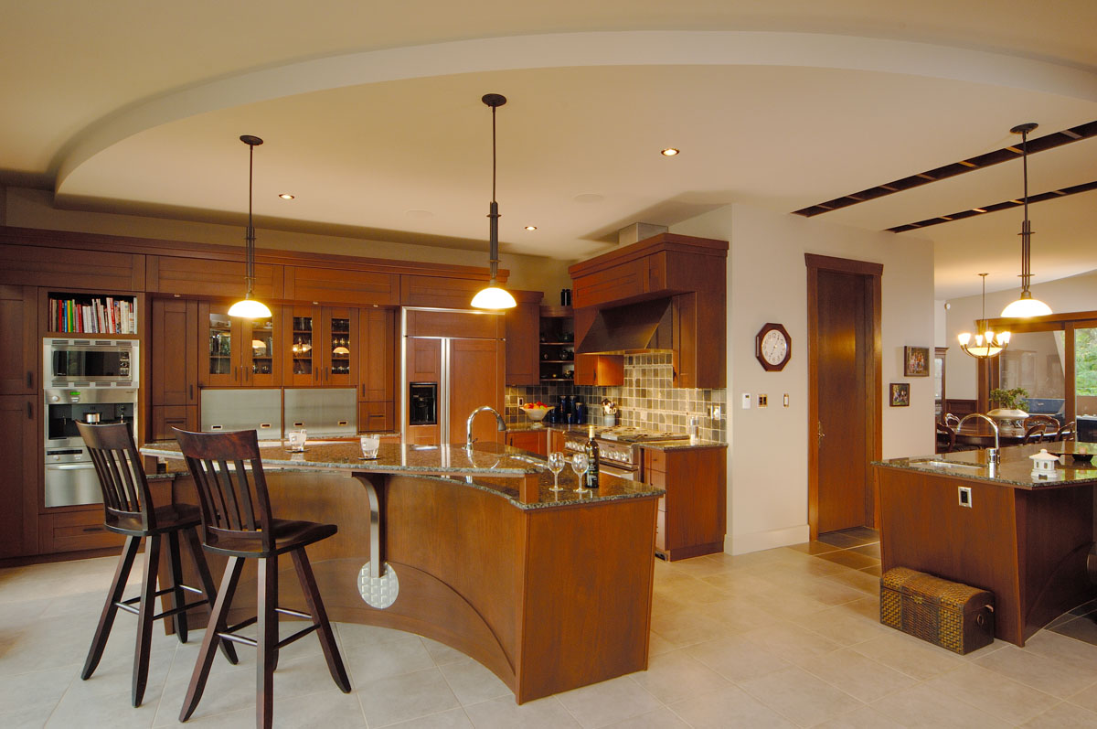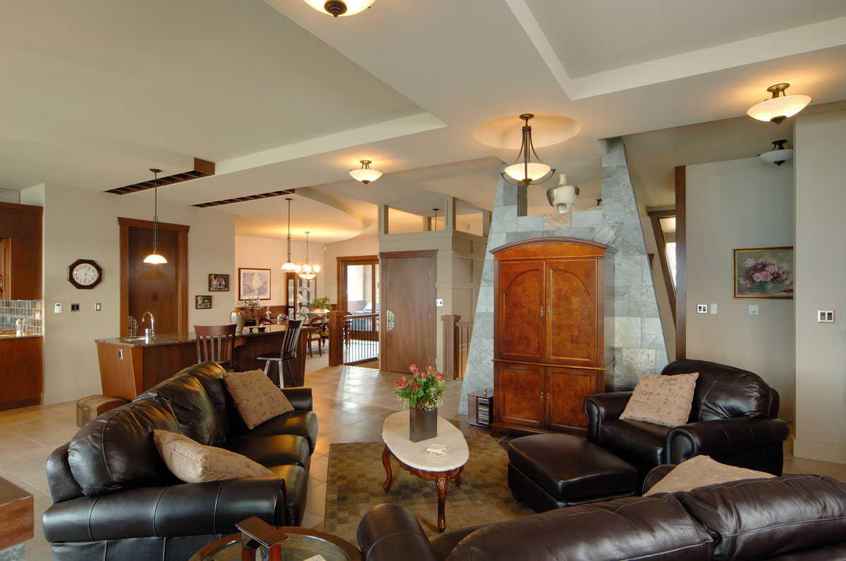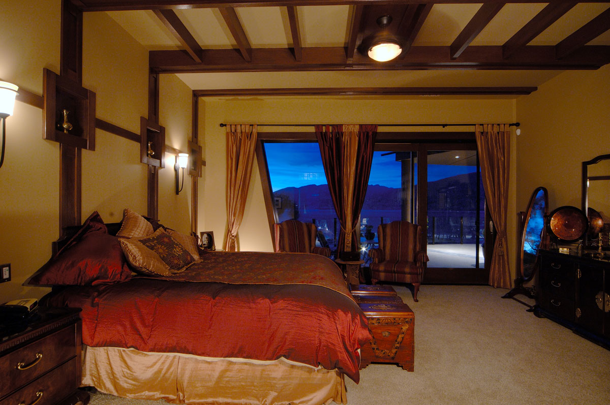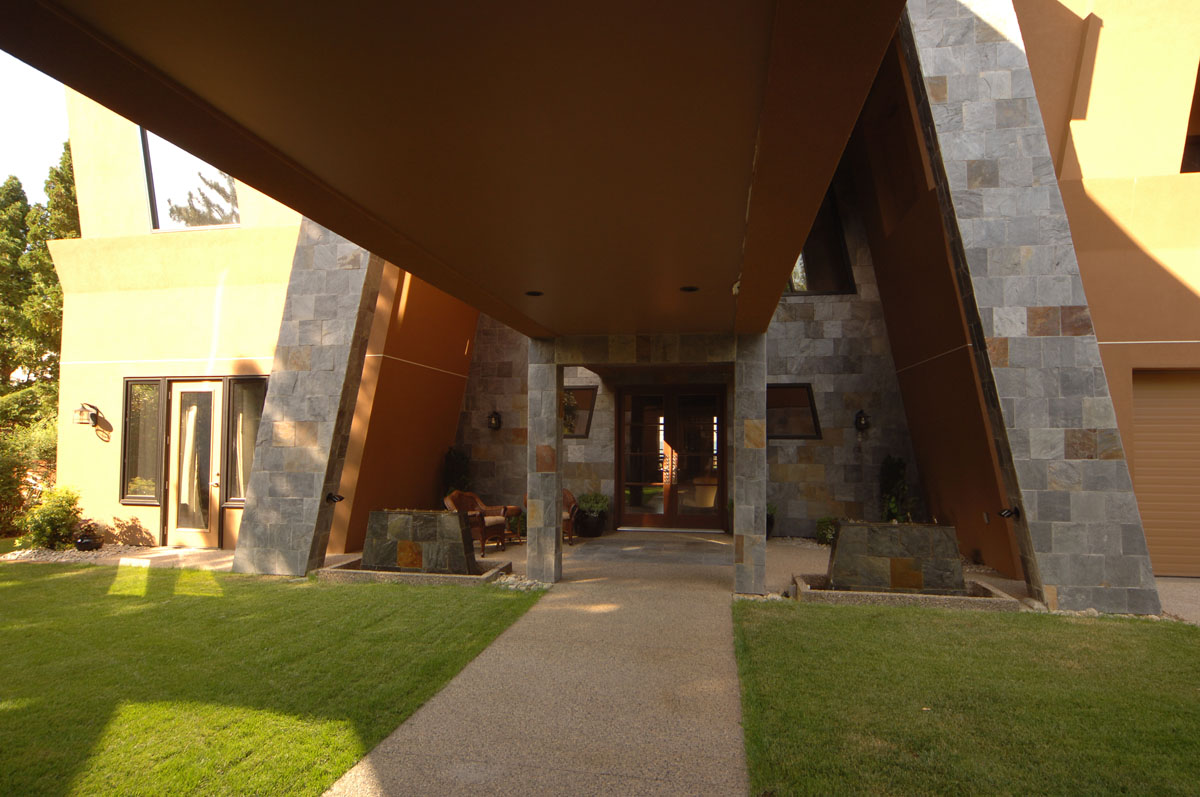 Kelowna Lakefront Properties - Gerrits Lakeshore Residence Their next lakefront lot was sited in between two existing homes with high property line hedges. With our history of doing custom homes on a team approach, it made for the next, "out of the box" experience. This symmetrically balanced concept was conceived by us and detailed by the Gerrits. (Homescape Building & Design Inc.) I felt that there was an opportunity to create privacy and a panoramic view by moving the living level up to the second floor. We simply added an elevator into the design to bring the groceries up to the kitchen level. Once up at that level a completely different view presented itself. The half round deck concept allowed for a 180 degree view. We designed the garage with a separate guest suite above it, connected by an enclosed bridge.
