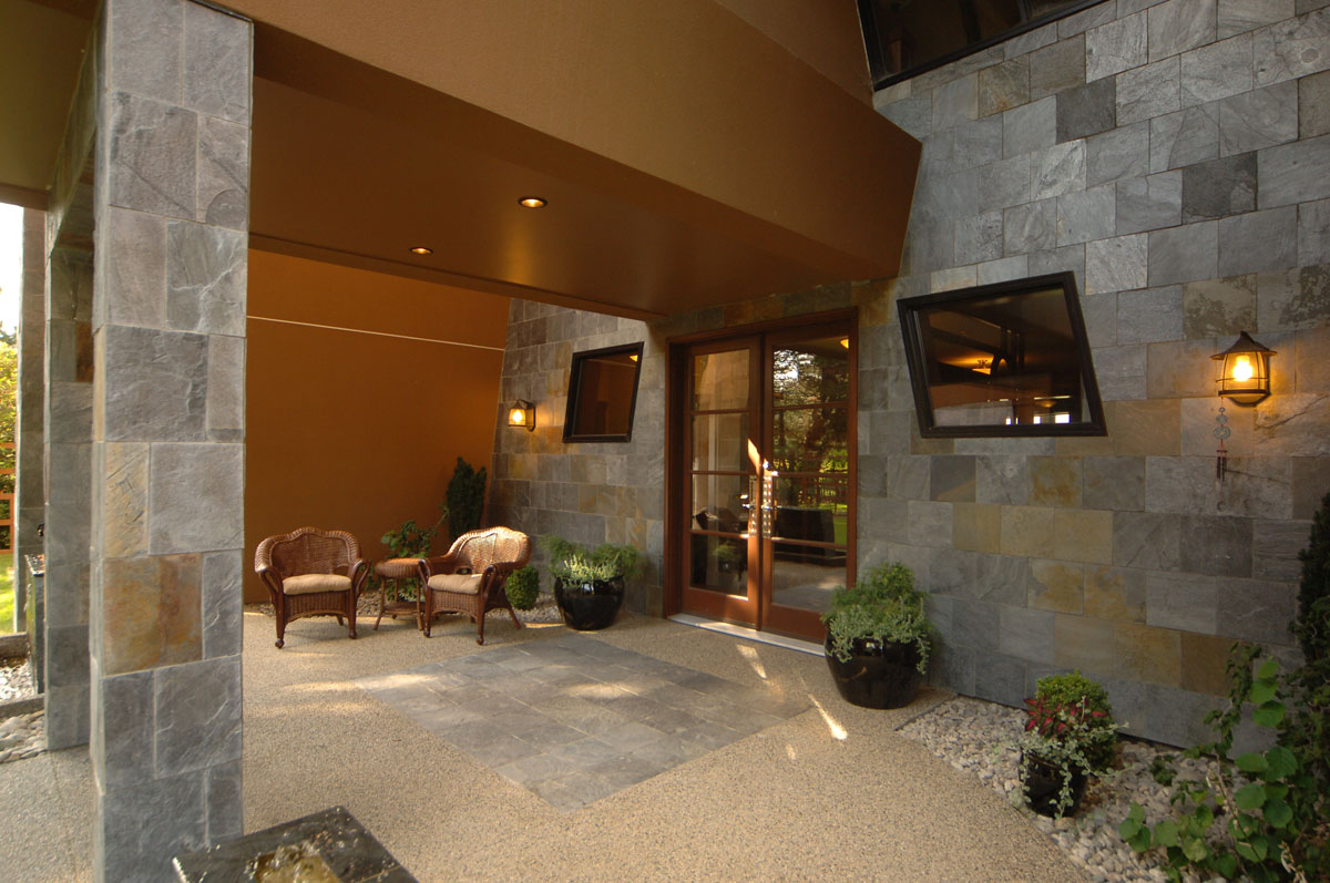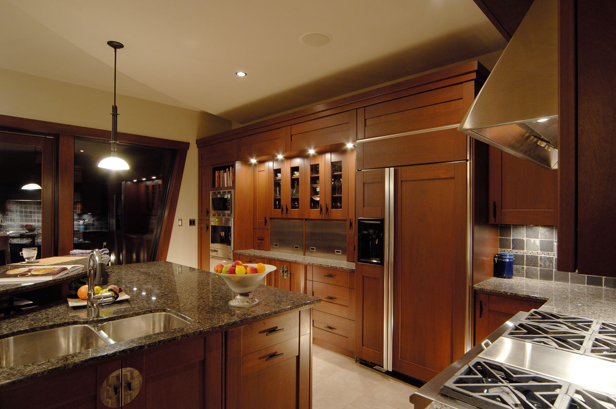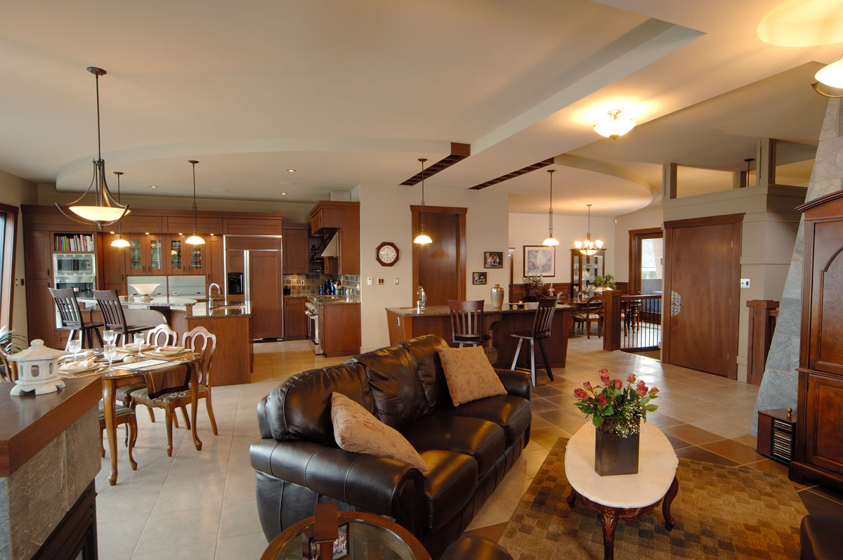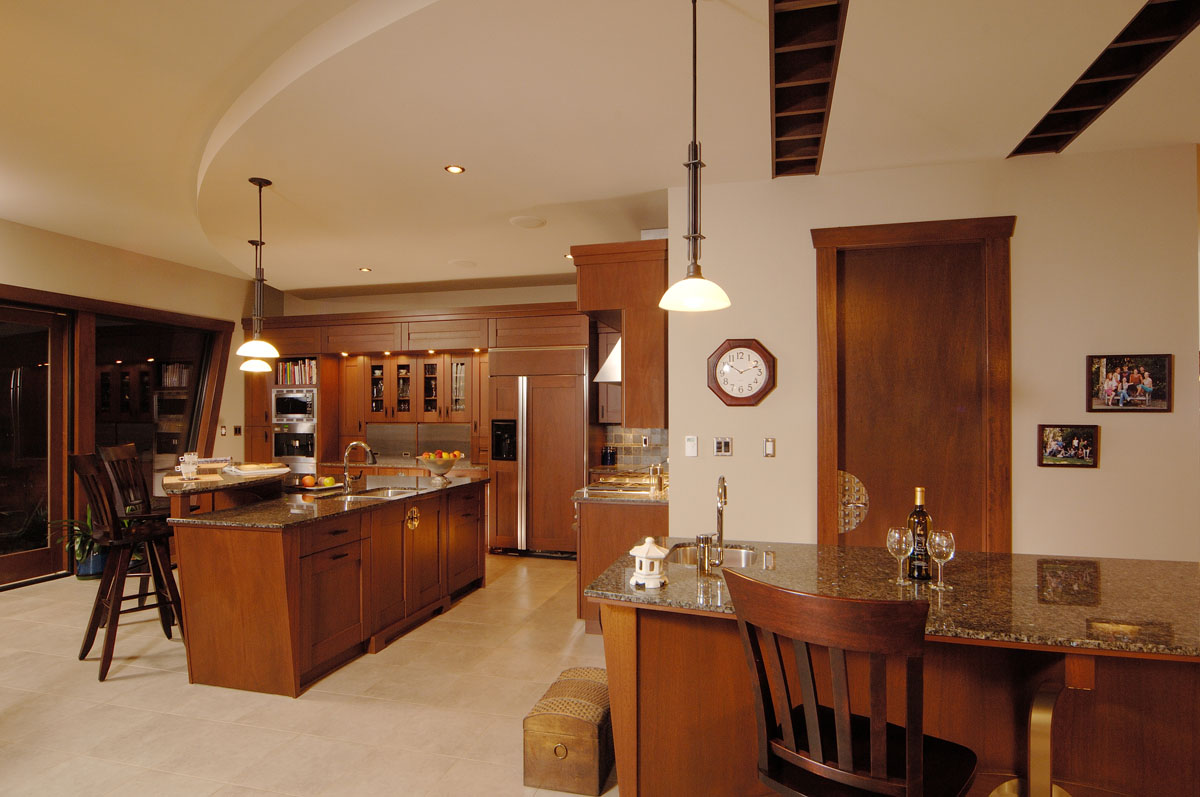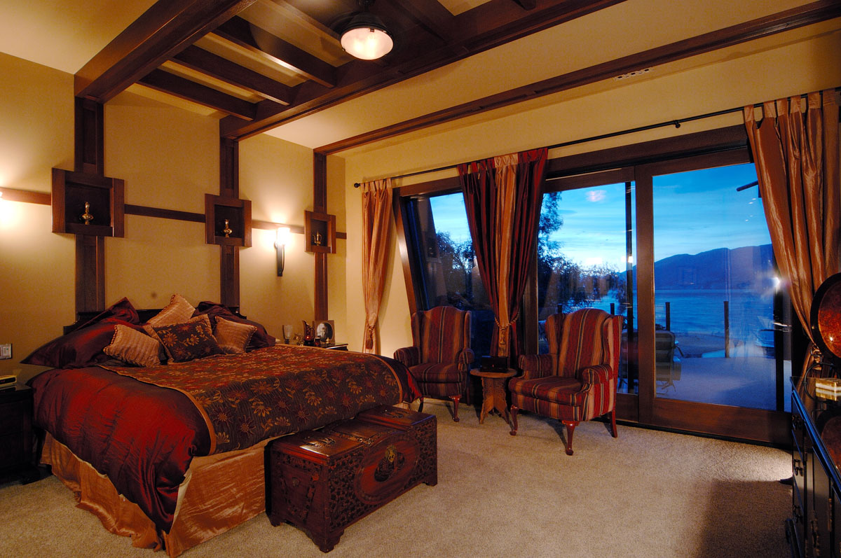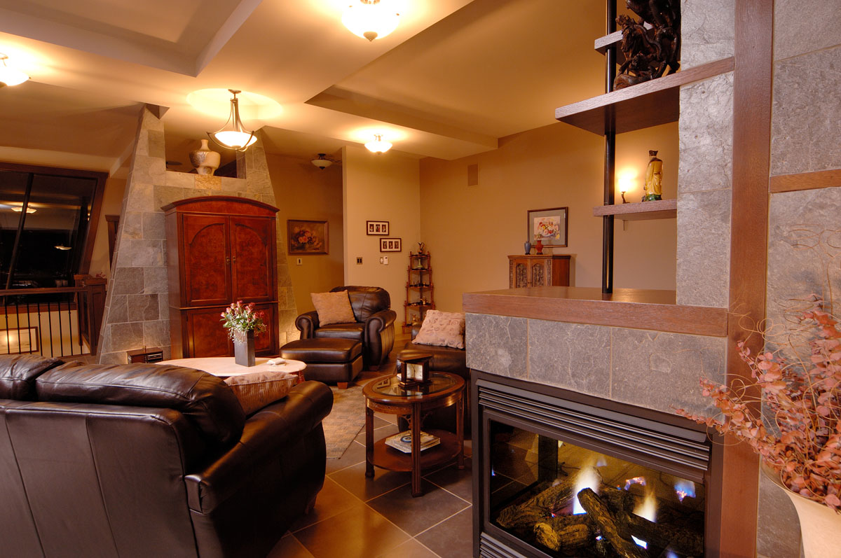 Kelowna Lakefront Properties - Gerrits Lakeshore Residence Their next lakefront lot was sited in between two existing homes with high property line hedges. With our history of doing custom homes on a team approach, it made for the next, "out of the box" experience. This symmetrically balanced concept was conceived by us and detailed by the Gerrits. (Homescape Building & Design Inc.) I felt that there was an opportunity to create privacy and a panoramic view by moving the living level up to the second floor. We simply added an elevator into the design to bring the groceries up to the kitchen level. Once up at that level a completely different view presented itself. The half round deck concept allowed for a 180 degree view. We designed the garage with a separate guest suite above it, connected by an enclosed bridge.