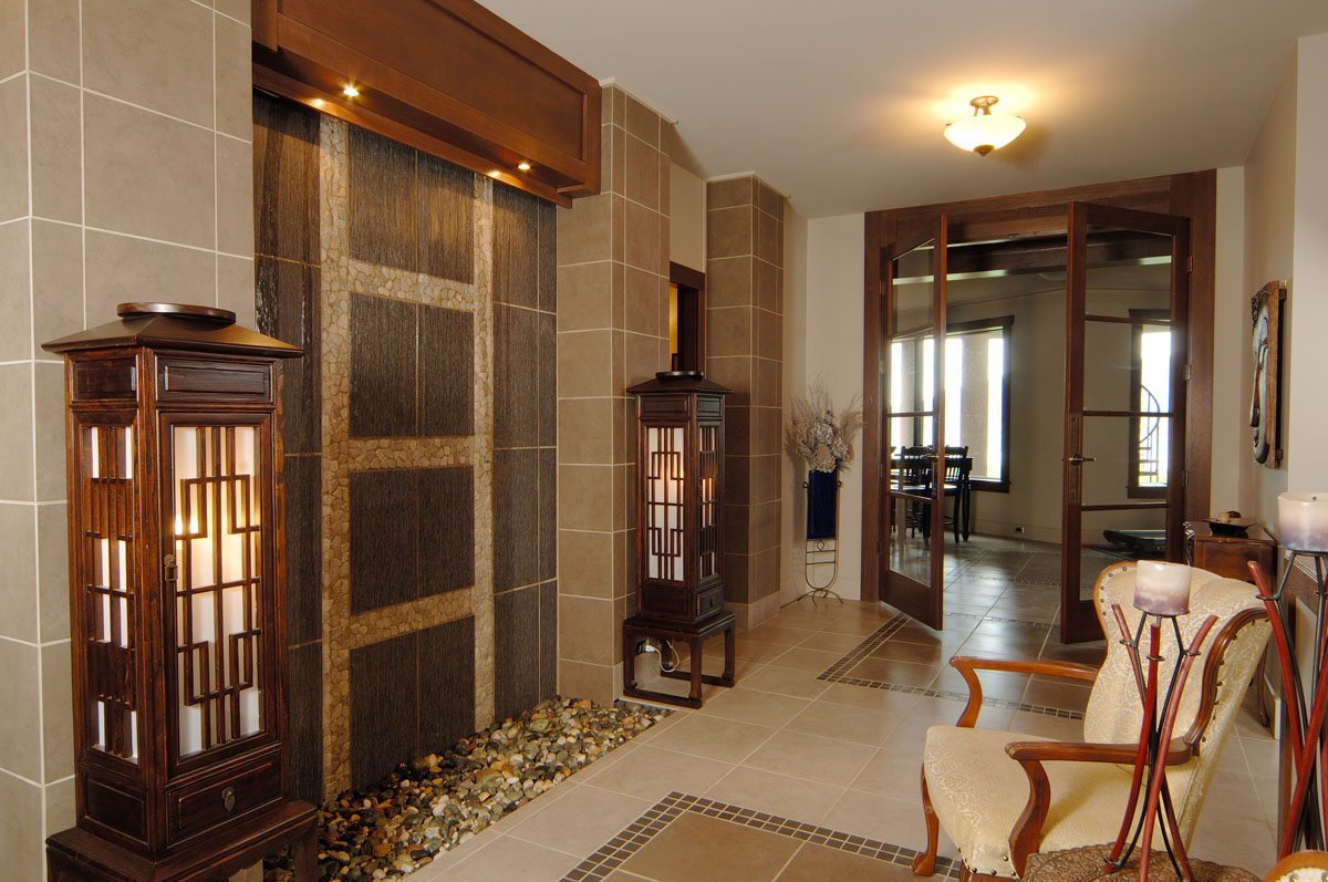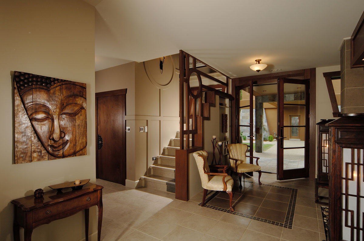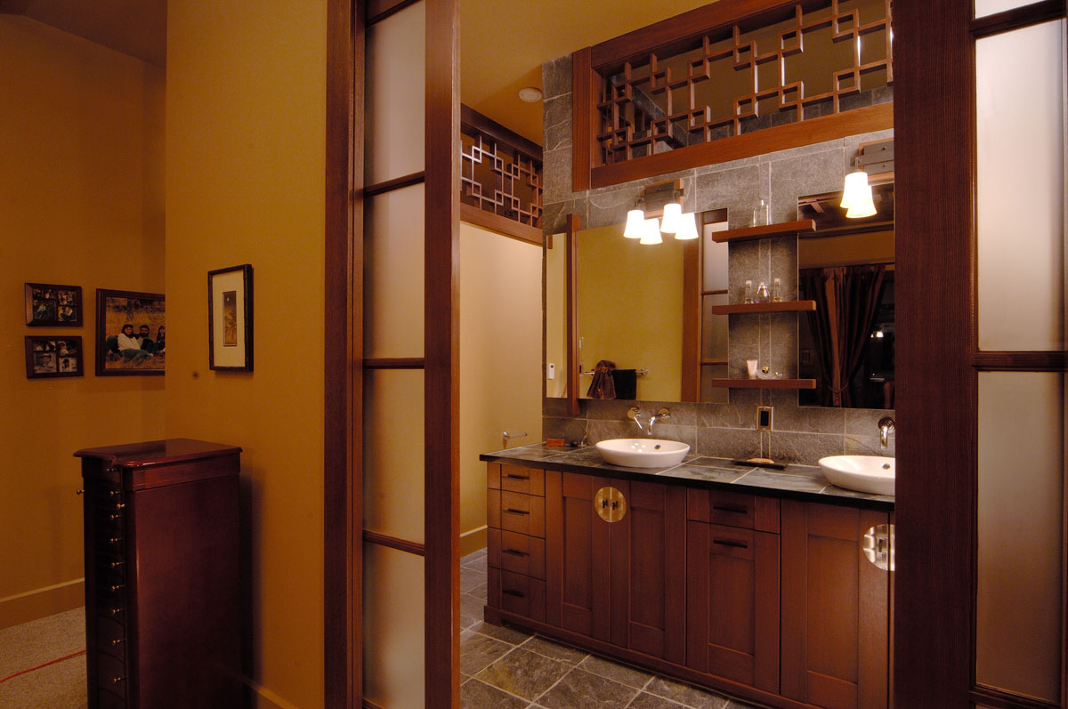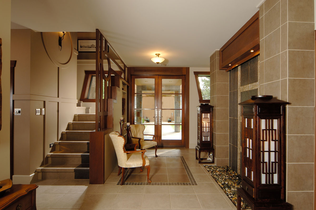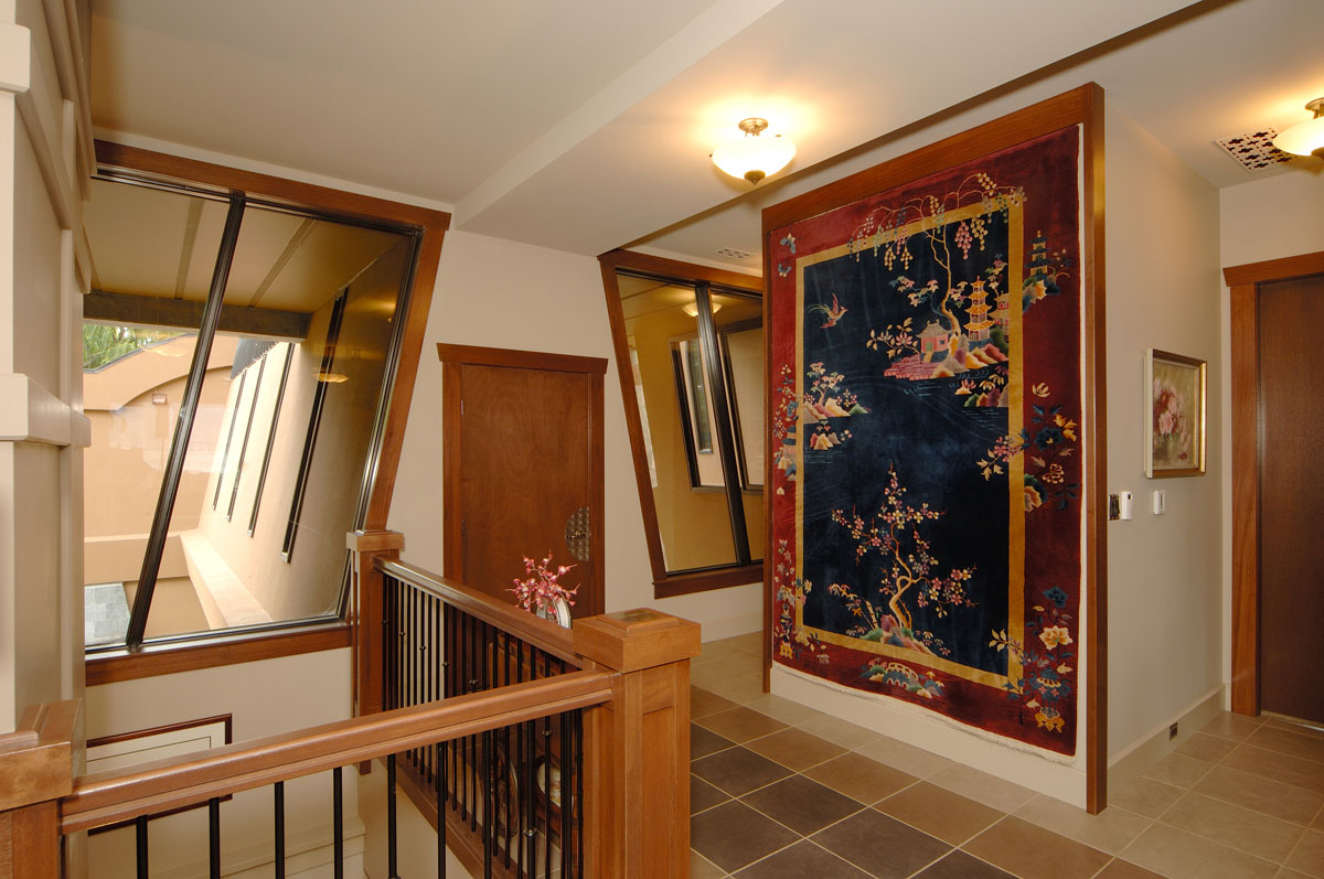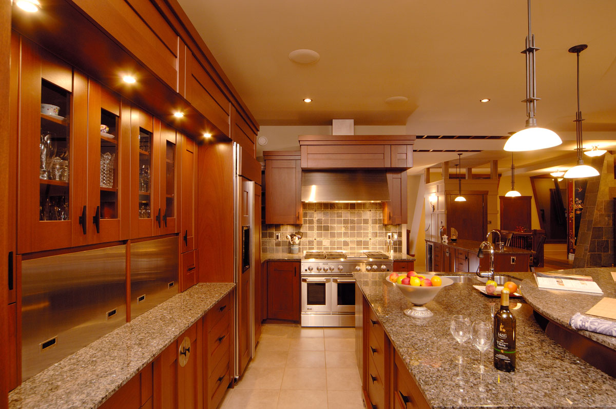 Kelowna Lakefront Properties - Gerrits Lakeshore Residence Their next lakefront lot was sited in between two existing homes with high property line hedges. With our history of doing custom homes on a team approach, it made for the next, "out of the box" experience. This symmetrically balanced concept was conceived by us and detailed by the Gerrits. (Homescape Building & Design Inc.) I felt that there was an opportunity to create privacy and a panoramic view by moving the living level up to the second floor. We simply added an elevator into the design to bring the groceries up to the kitchen level. Once up at that level a completely different view presented itself. The half round deck concept allowed for a 180 degree view. We designed the garage with a separate guest suite above it, connected by an enclosed bridge.